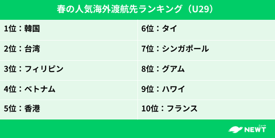■U29世代の旅行先は「韓国・台湾」が中心。フランスが10位に急浮上