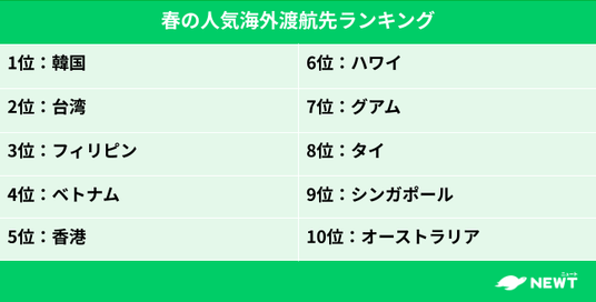 株式会社令和トラベル(本社:東京都渋谷区、代表取締役:篠塚 孝哉)が運営する、かしこい、おトク、旅行アプリ『NEWT(ニュート)』は、2026年3月1日~4月30日の旅行データをもとに、2026年春の海外旅行動向を分析しました。