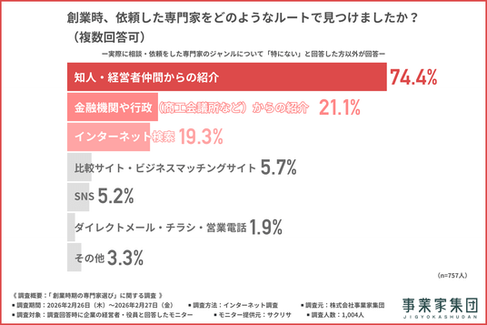 「創業時、依頼した専門家を見つけたルート」について尋ねたところ、『知人・経営者仲間からの紹介(74.4%)』が最も多く、『金融機関や行政(商工会議所など)からの紹介(21.1%)』『インターネット検索(19.3%)』と続きました。