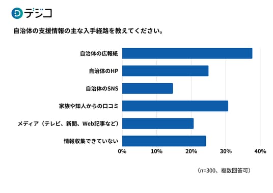 - 支援情報の入手経路は「広報紙」が最多。約4人に1人が「情報収集できていない」実態
