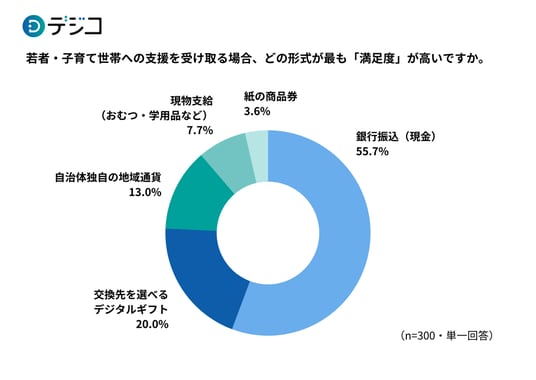 若者・子育て世帯への支援において、どの受け取り形式が最も「満足度」が高いか聞いたところ、「銀行振込(現金)」が55.7%で最多となりました。次いで満足度が高いのは「交換先を選べるデジタルギフト(20.0%)」であり、これら汎用性の高い形式が支持を集める一方で、「自治体独自の地域通貨(13.0%)」や「現物支給(7.7%)」、「紙の商品券(3.6%)」はいずれも低い数値に留まる結果となりました。住民は使い道が限定されるものよりも、自身のライフスタイルに合わせて活用できる形式に高い満足度を感じていることが分かります。