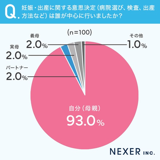 その結果、93.0%が「自分(母親)」と回答しました。続いて「パートナー」が2.0%、「実母」が2.0%、「義母」が2.0%、「その他」が1.0%でした。妊娠・出産に関わる大切な決断は、多くの女性が自分自身で担っていることがわかります。