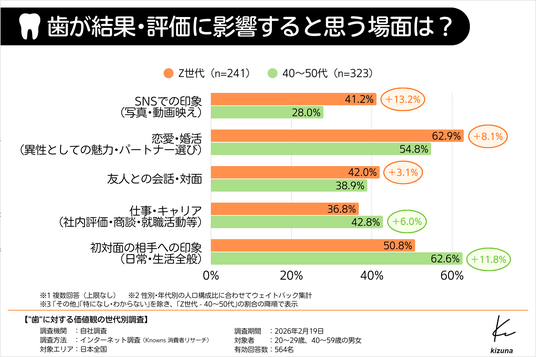 Z世代と40~50代の男女564名にアンケート実施!若年層の「恋愛・SNS」から親世代の「身だしなみ」まで、ライフステージで変化する歯の役割と、理想の口元へ近づくためのヒントを探る。