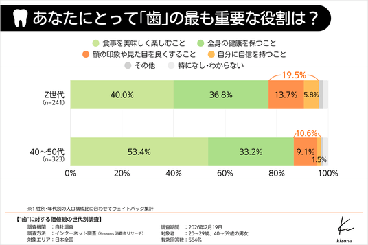 ・歯の役割に「見た目・自信」を最重視するZ世代は約2割、親世代の約1.8倍