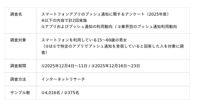 本調査ではスマートフォンを利用している全国の老若男女4,016名へアンケート調査を行い、そのうち金融系、ポイント系、小売系3業種(スーパーマーケット / 百貨店・商業施設 / ドラッグストア)の計5業種の代表的なアプリでプッシュ通知を受け取っていると回答した375名に、さらに詳細なプッシュ通知利用状況調査を行いました。調査結果は一部を本リリースで公開するとともに、ホワイトペーパーとして無料公開いたします。
