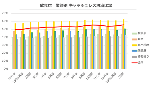 - 業態別にキャッシュレス決済比率をみると、1月度から2月度にかけて、すべての業態で増加した。業態の中で最もキャッシュレス決済比率の高い専門料理は、62.7%と前月から1.3pt増加した。