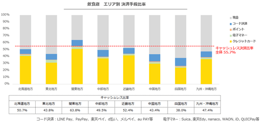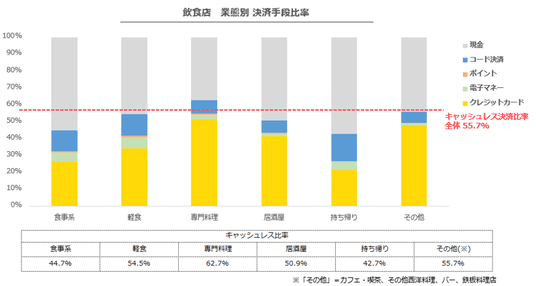 - 業態別にキャッシュレス比率を見ると、すべての業態で40%を超える。またコード決済比率が一番高い「持ち帰り」では、その割合が16.0%であった。