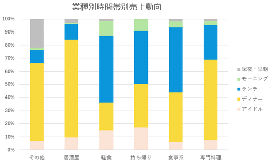 - 業種別時間帯別売上動向を見ると、2月度でディナータイムの売上割合が一番多いのは居酒屋、次に専門料理となりその差は13.4ptとなった。一方ランチタイムの売上割合が一番高いのは、軽食、次に食事系となり、その差は1.4ptとなった。