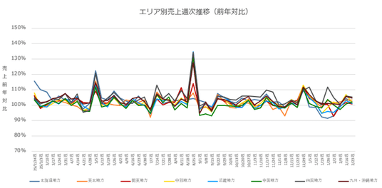 - 2月売上における、前年対比の伸長率(地方平均)は101.2%と前月から0.5pt増加した。各地域の売上伸長率は、四国地方が最も高く前年対比104.0%となった。