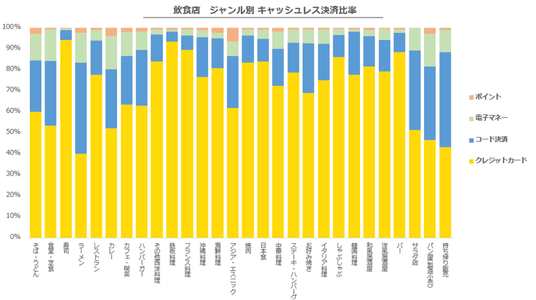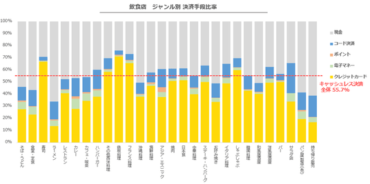 集計内容:飲食店 ジャンル別 キャッシュレス決済方法比率、キャッシュレス決済比率(内訳)