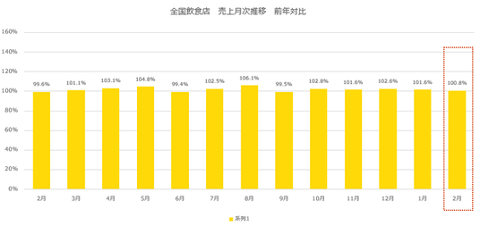 2月度売上は前年対比100.8%と前月から0.8pt減少した