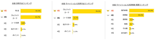 - 決済方法は、現金が44.3%で前月に引き続き第1位となった。2位のクレジットカードは43.7%とその差は0.6ptとなった。キャッシュレス決済の内訳は、クレジットカードが78.3%、次いでコード決済が15.7%となった。業態別で見ると、キャッシュレス決済利用が最も多いのは専門料理で、前月から0.6pt減少し、50.2%となった。