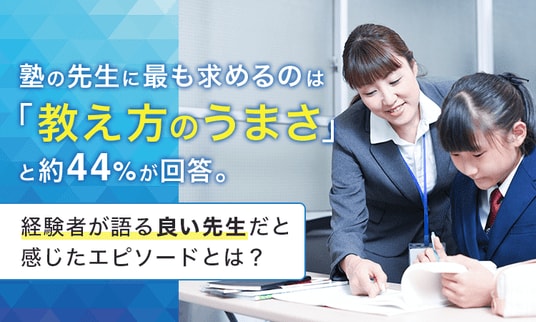 今回の調査では、塾の先生に求める資質として「教え方のうまさ」が約44%ともっとも高い割合を占めました。また、学校と塾では先生に求められる役割が異なると考える方が半数を超えており、塾には学力向上に特化した専門的な指導が期待されていることがわかりました。