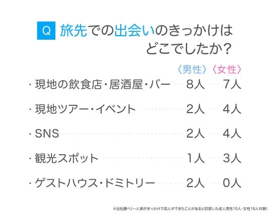 「一人旅がきっかけで恋人ができたことがある」と回答した男性15人・女性18人に「旅先での出会いのきっかけはどこでしたか?」と尋ねました。