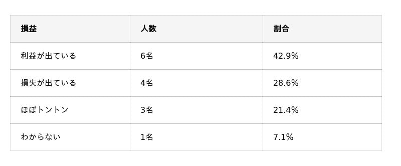 - 会社員(契約・派遣社員)14名のうち42.9%が損失、利益は28.6%