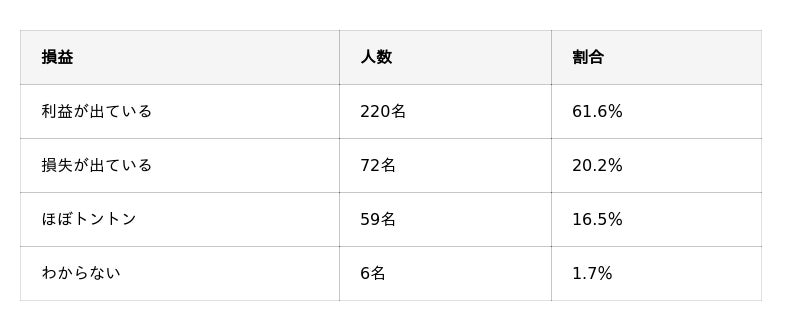 - 保有者358名のうち、61.6%が「利益が出ている」と回答