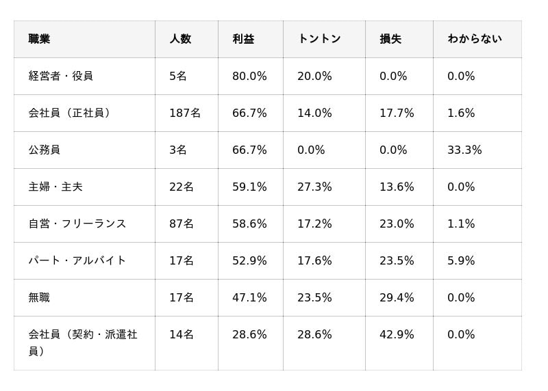 今回の調査では、職業別に暗号資産投資の損益状況を分析し、「どの職業が利益を出しやすく、どの職業が損失を抱えやすいのか」という傾向を明らかにしました。