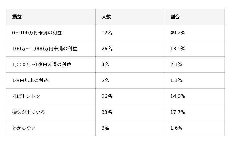 最も多いのは「0~100万円未満の利益」で約半数を占めており、比較的少額から着実に利益を積み上げている層が多い傾向が見られます。