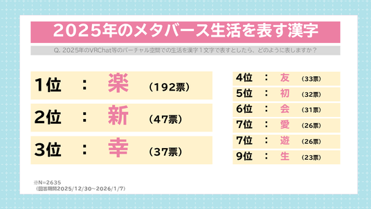 アンケート結果からは、多くのメタバース生活者が「フレンドとの雑談・集まり」を行いながら、年越しをしている様子や、2025年を振り返って「楽」などのポジティブな漢字を思い浮かべる人が多いことがわかりました。