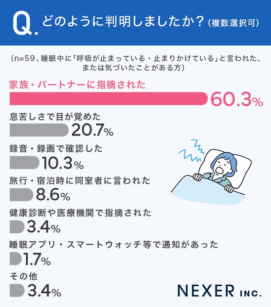 次いで「息苦しさで目が覚めた」が20.7%、「録音・録画で確認した」が10.3%、「旅行・宿泊時に同室者に言われた」が8.6%と続きます。