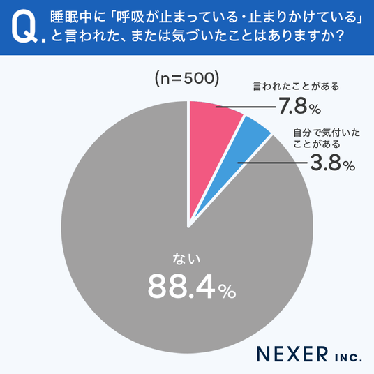 その結果「言われたことがある」が7.8%、「自分で気付いたことがある」が3.8%で、合わせて11.6%の方が睡眠中の呼吸停止を経験、または指摘されたことがあるとわかりました。一方で「ない」は88.4%でした。