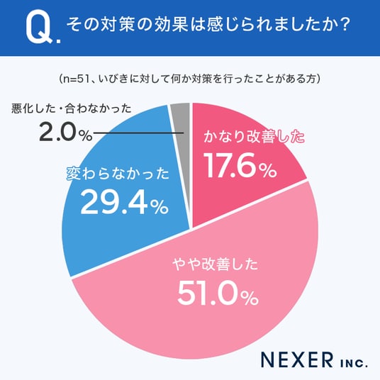 その結果「やや改善した」が51.0%と半数を超え、「かなり改善した」の17.6%と合わせると、68.6%の方が何らかの効果を感じていることがわかりました。一方で「変わらなかった」は29.4%、「悪化した・合わなかった」は2.0%でした。