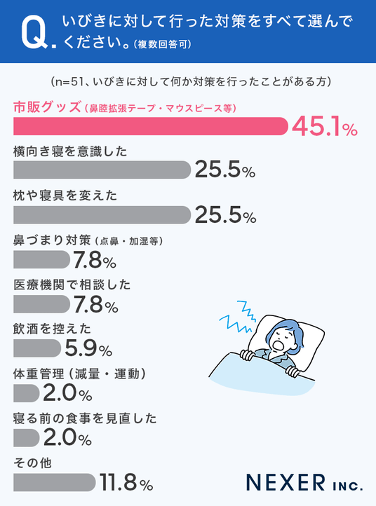 最も多かったのは「市販グッズ(鼻腔拡張テープ・マウスピース等)」で45.1%でした。次いで「横向き寝を意識した」と「枕や寝具を変えた」がそれぞれ25.5%で同率となりました。