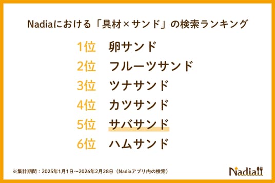 Nadiaの検索データ(※2)によると、サンドイッチの検索数は例年4月が年間で最も多く、春の行楽に向けて需要がピークを迎えます。そんな中、「具材×サンド」の検索で、定番のハムサンドを抑えて5位となった「サバサンド」に注目。2023年比で検索数は162.7%へと大きく伸長しました。また、同様に注目なのがベトナム風サンドイッチの「バインミー」で、こちらの検索数も144.6%と急増しています。