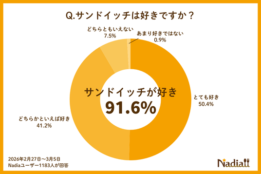 Nadia株式会社(東京都港区/代表取締役社長 葛城嘉紀)にて運営している料理メディア「Nadia(ナディア)」(URL:https://oceans-nadia.com/)は、3月13日の「サンドイッチの日」にちなみ、「サンドイッチ」に関するアンケート調査(※1)を行いました。