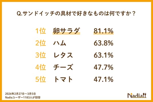 また、好きな具材アンケートでは、ランキング上位から「卵サラダ」「ハム」「レタス」「チーズ」「トマト」と続き、中でも「卵サラダ」は8割超えと高い支持を集めました。