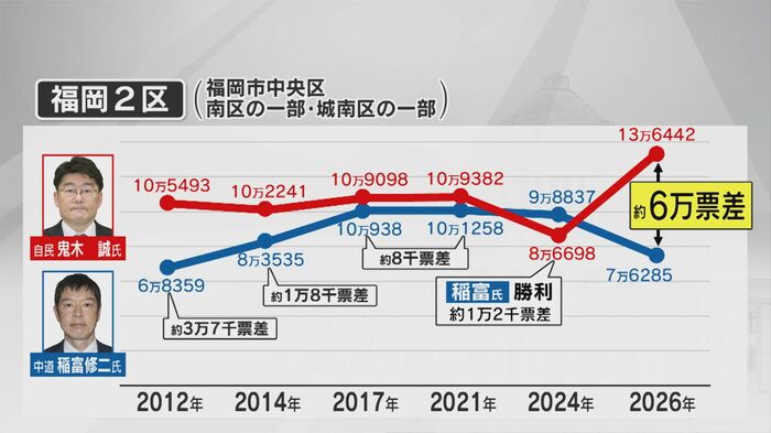 鬼木誠氏(自民)⇒13万6442票 稲富修二氏(中道)⇒7万6285票