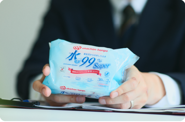 他社のおしりふきには「水99.9%」の成分を掲げているものが多い。しかしアカチャンホンポはあえてこの0.9%に追随しない。わずか1種の薬剤を使うことで容易に99.9%にすることができるが、その変化によって、本当により高い満足につながるのかという疑問が残る以上は、変える必要がないと考えているからだ。