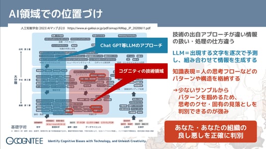 本Webinarで紹介した分析技術は、文章生成を主目的とする生成AIとは異なり、知識工学・認知科学を基盤とした「知識表現AI」です。この技術は、話題と話題の関係性や思考フローの構造を捉え、複数データ間の差異や過不足を検出することに特化しています。LLMのように大量テキストを生成するのではなく、人の思考や会話の構造パターンを扱うため、少ないサンプルでも個人や組織の傾向、固有の見落とし、改善余地を把握しやすい点が特徴です。コグニティではこの技術を13年前から研究開発し、特許も取得しており、営業トーク分析、管理職指導、採用面接評価など多様な場面で活用してきました。
