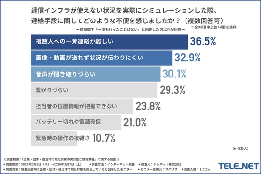 最後に、前問で『一度も行ったことはない』と回答した方以外に、「通信インフラが使えない状況を実際にシミュレーションした際、連絡手段に関してどのような不便を感じたか」について尋ねたところ、『複数人への一斉連絡が難しい(36.5%)』と回答した方が最も多く、『画像・動画が送れず状況が伝わりにくい(32.9%)』『音声が聞き取りづらい(30.1%)』と続きました。
