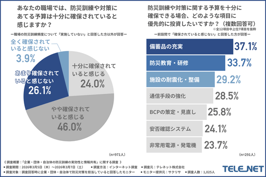 「あなたの職場では、防災訓練や対策にあてる予算は十分に確保されていると感じるか」について尋ねたところ、3割が『全く確保されていると感じない(3.9%)』または『あまり確保されていると感じない(26.1%)』と回答しました。