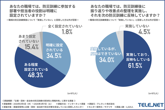 「あなたの職場では、防災訓練に参加する部署や担当者の役割は明確に設定されているか」について尋ねたところ、約8割が『明確に設定されている(34.5%)』『ある程度設定されている(48.3%)』と回答しました。