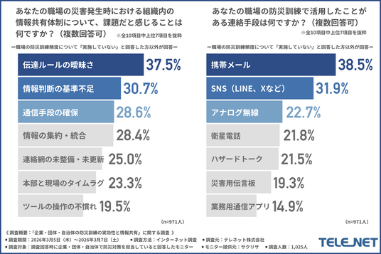 防災対策担当者1,025名に調査、防災訓練中の課題は「判断や指示出し」「情報伝達」といったソフト面に集中