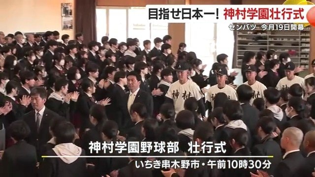 開幕まであと7日と迫った選抜高校野球大会。2年ぶり7回目の出場を決めた神村学園で3月10日、全校を挙げた壮行式が行われ、梶山侑孜キャプテンが「神村学園らしく繋ぐ野球と泥臭いプレーで、最終的に日本一に向けて精一杯頑張りたい」と力強く決意を表明した。