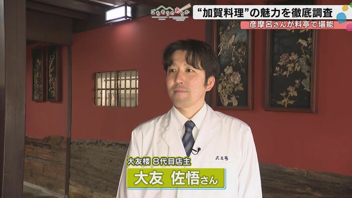 金沢市尾山町にある同店は、初代大友義左衛門が加賀藩前田利常の御料理方を務めていたことをルーツとする歴史ある料亭だ。現在の八代目当主、大友佐悟氏が語る加賀料理の世界は、料理そのものだけでなく、器や空間演出までを含めた総合的な文化体験である。