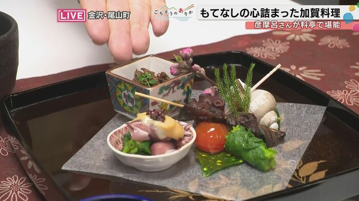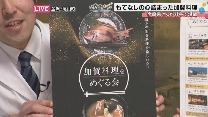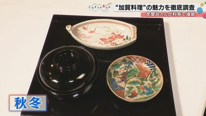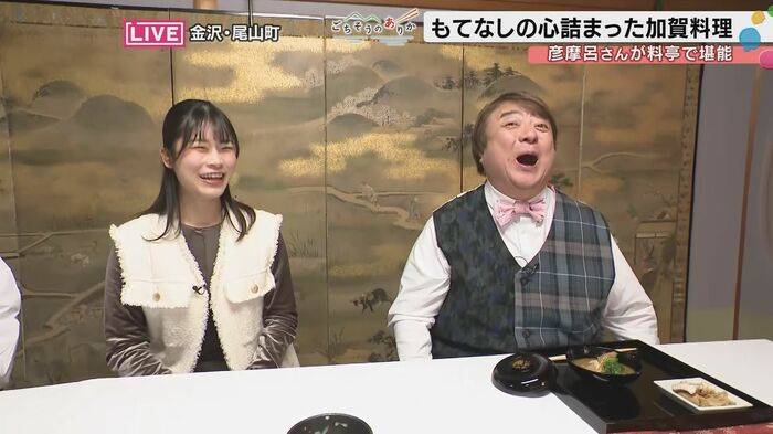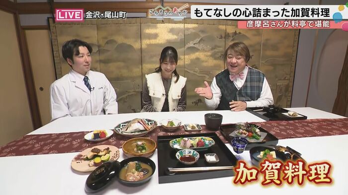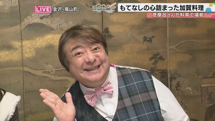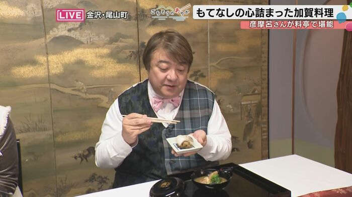 加賀料理を味わった彦摩呂さん。「もう五感が刺激されるっていうか、もうお料理にとどまらず器も、もうほんとに美術館のような、心が本当に豊かになりますね。なんかお殿様になった気分です。」