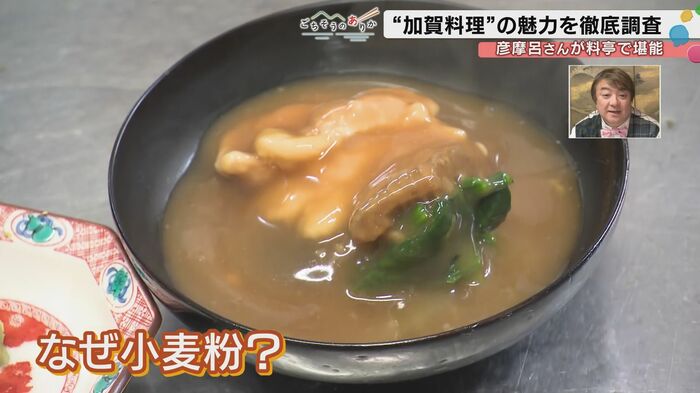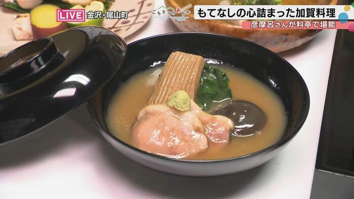 治部煮を味わった彦摩呂氏は、「なんと奥深い餡の味がもう、鴨肉のほど良い脂と交わって。その味をわさびがぎゅっと締めて。めちゃめちゃおいしいです、たまりません」と絶賛した。