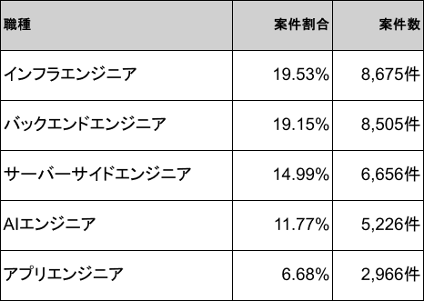 2026年3月時点のPython案件の職種は、インフラエンジニア19.53%(8,675件)が最多、次いでバックエンドエンジニア19.15%(8,505件)、サーバーサイドエンジニア14.99%(6,656件)、AIエンジニア11.77%(5,226件)、アプリエンジニア6.68%(2,966件)です。