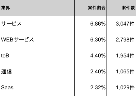 2026年3月時点のPython案件は、サービスが6.86%(3,047件)で1位、WEBサービスが6.30%(2,798件)で2位、toBが4.40%(1,954件)で3位、通信が2.40%(1,065件)で4位、SaaSが2.32%(1,029件)で5位となり、上位5業界で全体の約22.3%を占めます。
