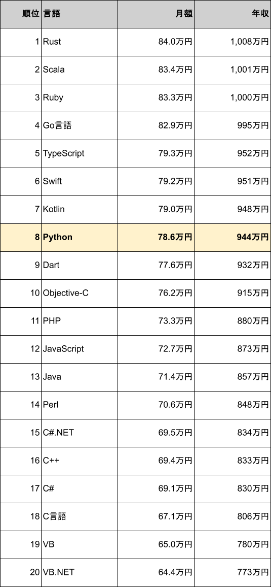 Python案件の平均月額単価は78.6万円、平均年収は944万円で、プログラミング言語別の年収ランキングでは8位に位置しています。