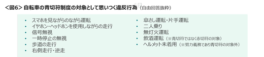 その他「信号無視」「一時停止の無視」「傘さし運転・片手運転」「二人乗り」「無灯火運転」といった通行ルール違反や周囲への安全配慮を欠く回答もみられた。また、赤切符の対象となる「飲酒運転」や努力義務である「ヘルメット未着用」を対象と誤認している回答も一定数みうけられた。<図6>