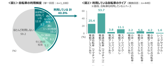 利用している自転車のタイプは、「普通自転車:電動アシストなし」が53.7%と突出。次いで、「普通自転車:電動アシストあり」は25.4%と続く。<図2>