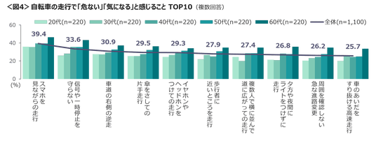 危ない・気になると感じる自転車の走行は、「スマホを見ながらの走行」「信号や一時停止を守らない」「車道の右側の逆走」がTOP3。