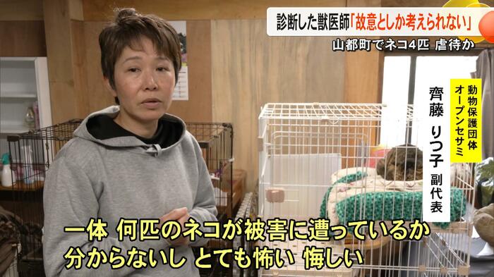 動物保護団体オープンセサミの齊藤りつ子副代表は「そのまま息を引き取ったような子もいると思う。一体何匹のネコが被害にあっているかわからないし、とても怖い、悔しい」と話す。