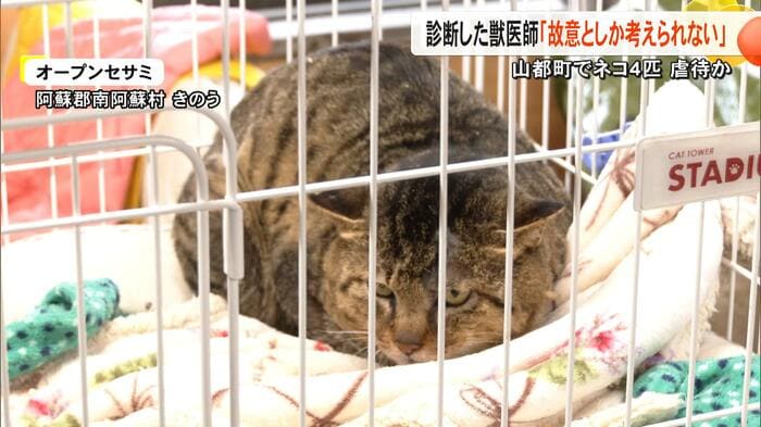 上益城郡山都町でやけどをするなどして保護されたネコ4匹が「虐待の可能性がある」と診断されたことが分かった。診断した獣医師はTKUの取材に、「人が故意にやったとしか考えられない、異常事態」と指摘している。