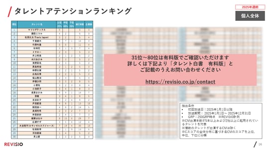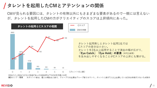 本資料は、REVISIOが独自に取得した「テレビの前にいる人が画面を注視したか」がわかるアテンションデータを基に、タレント出演CMを分析したレポートです 。